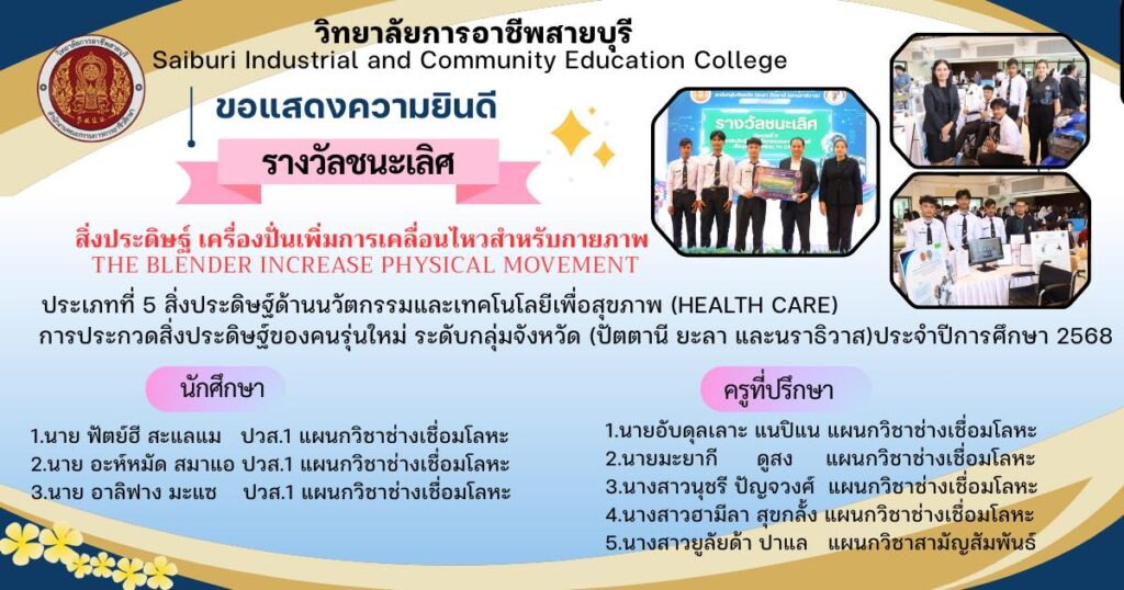 💐 ขอแสดงความยินดี กับ คณะครู และนักเรียน นักศึกษา ได้รับรางวัลชนะเลิศ  การแข่งขันสุดยอดนวัตกรรมอาชีวศึกษา การประกวดสิ่งประดิษฐ์ของคนรุ่นใหม่ ประจำปีการศึกษา 2568 ระดับกลุ่มจังหวัด (ปัตตานี ยะลา และนราธิวาส)